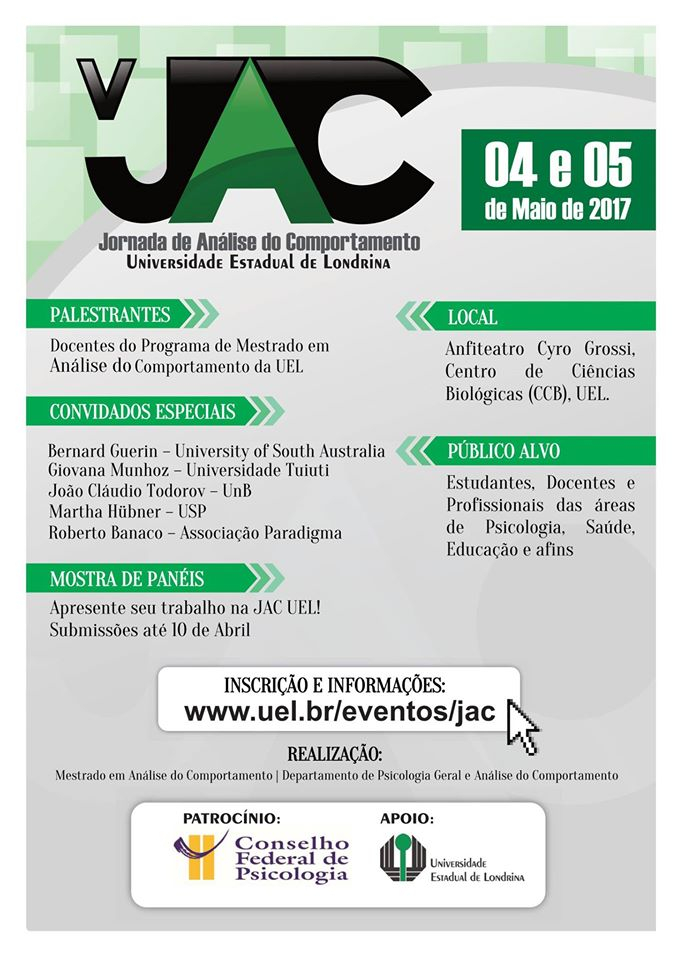 Nesse fim de semana (04 e 05 de maio de 2017) será realizada a Jornada de Análise do Comportamento da Universidade Estadual de Londrina.